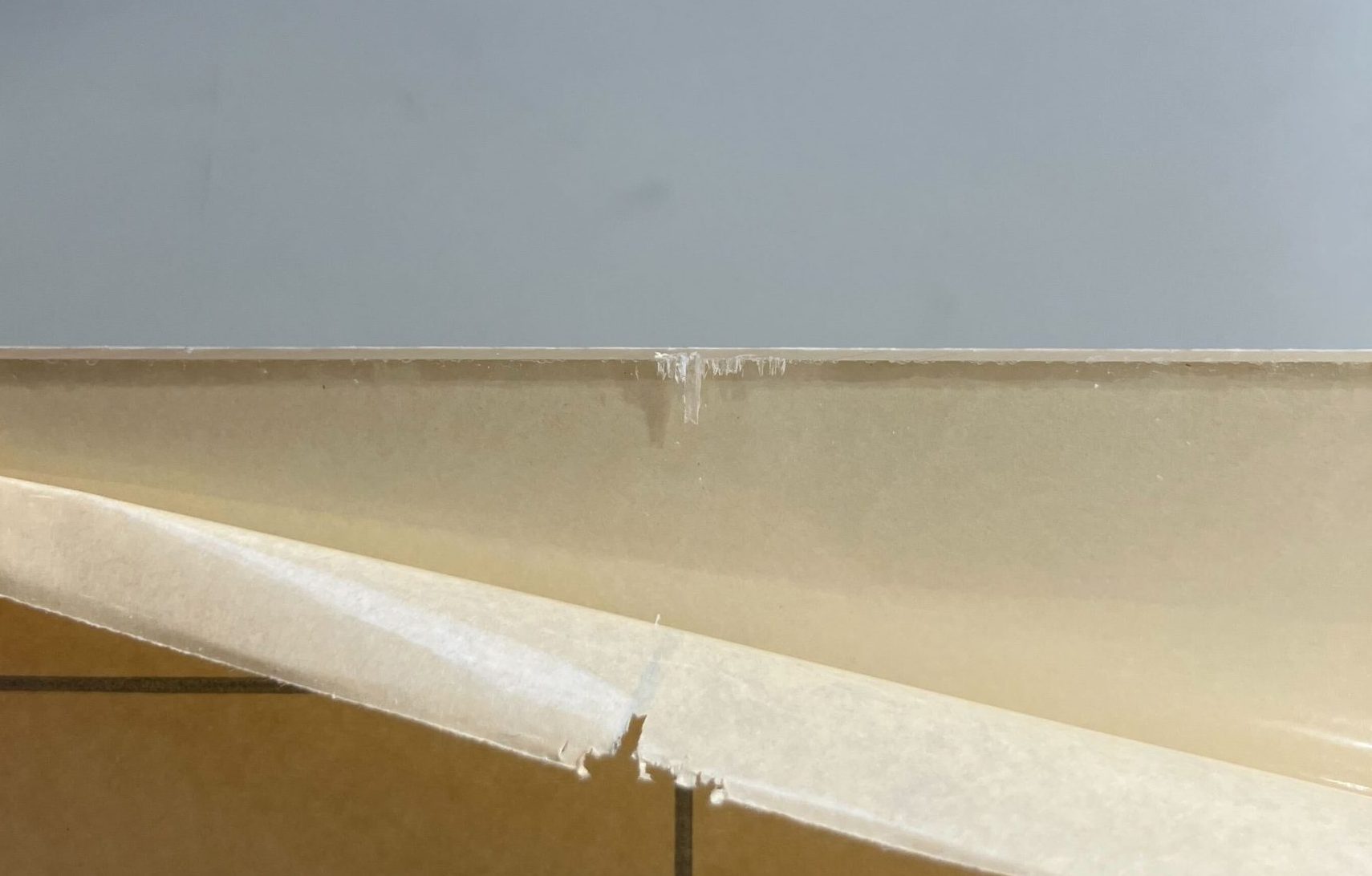 溝の深さがアクリル板の厚みの1/3くらいになったところで、机の角を使ってパキッと割り折りました。すると…きれいに切れた!