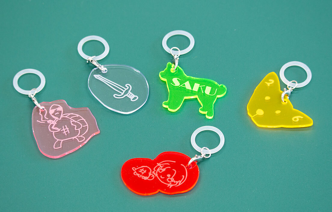 アクリル板を好きな形にくり抜き、名前やイニシャル、イラストを彫刻します。加工の様子を間近で見学しながら、ものづくりの裏側を体感いただけます。