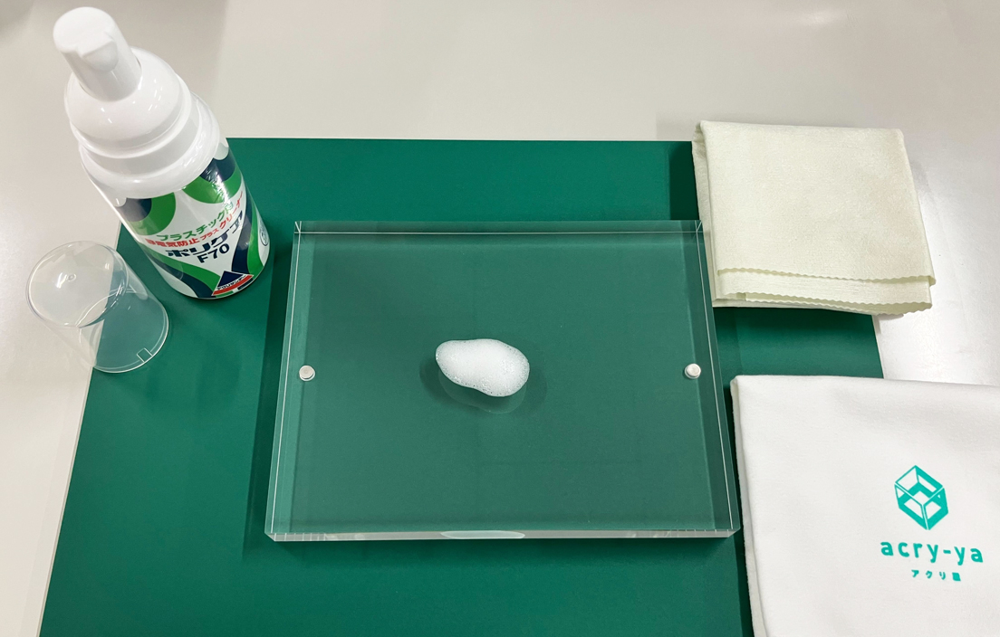 保護紙を剥がす際、アクリルの特性上静電気でホコリがつきやすく、ホコリがついた状態でスライドすると傷がつく可能性があるため、ポリケアとウェルシーなどのクリーナー使用をおすすめします。今回商品ページの撮影時にもホコリに苦戦したので、静電気防止効果のあるポリケアとウェルシーを一緒に使用したところ、ホコリが付きにくくなり、指紋も簡単に拭き取れてアクリルの綺麗さを保てました。アクリル製品を長く美しく使うためのコツとして、ぜひみなさまにおすすめしたいです。