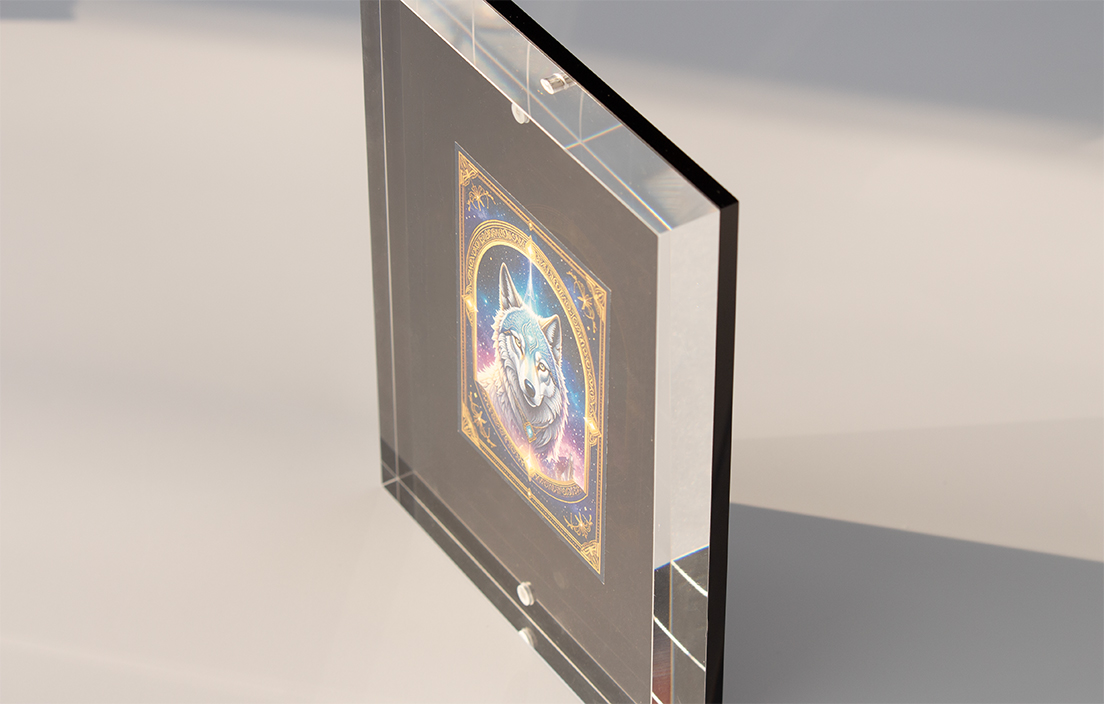 手にした瞬間、しっかりとした重みがあり、純粋に綺麗だと思いました。アクリルはもともと透明度が高いのですが、表板が15mm厚+裏板が5mmで合計20mmあるので厚みがある分、丁寧に磨かれた端面の部分に光が反射し高級感がありました。蛍光エッジ色は端面の発色が鮮やかで美しい仕上がりで、ブルーやビタミンカラーなど新たな色も追加されたことで、推し活にもぴったりだと思います。個人的にはガラスエッジも透明感が美しくて魅力的でした。どの色も素敵で「どれが一番?」と選ぶのが難しいです。飾る場所やお好みに応じて色を選べるので、どの色をお選びいただいてもみなさまにご満足いただけると思います。