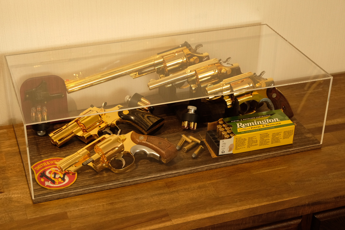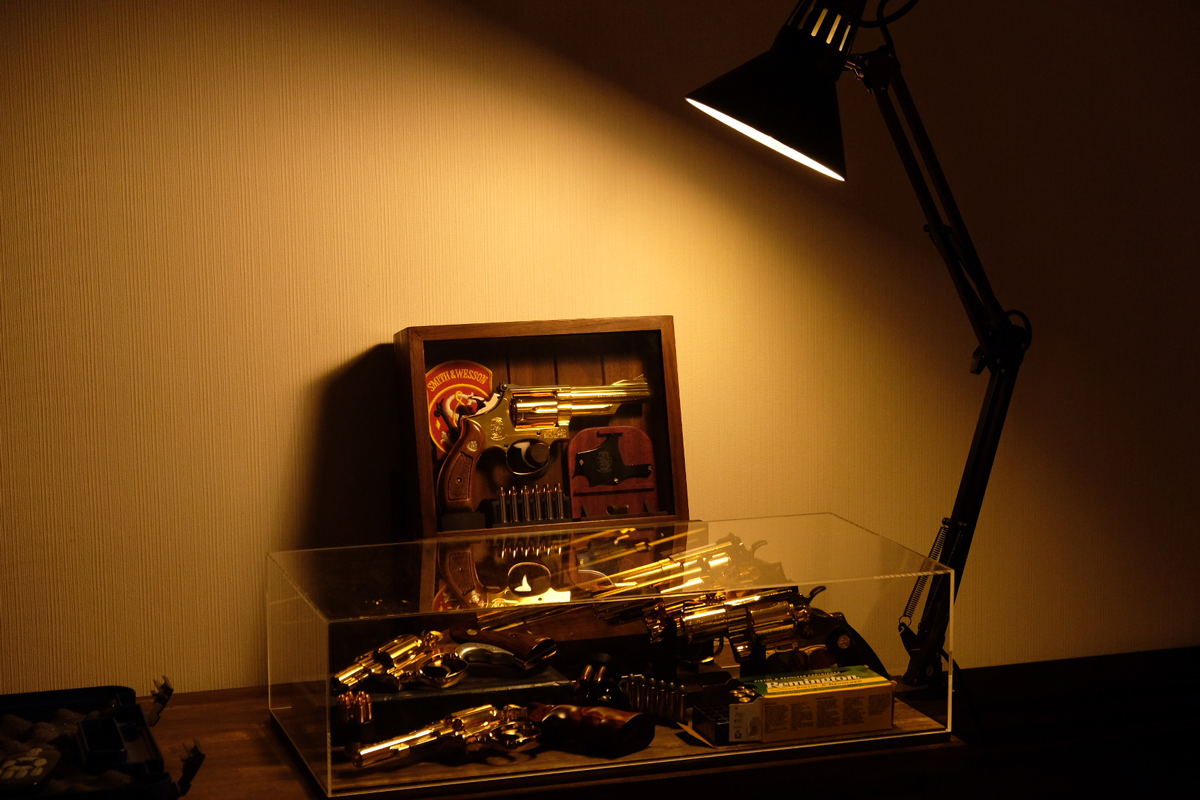 お手製の台座のクオリティがあまりに高く、格好良さに驚きました!桐の集成材をご自身で加工されたとのこと、深い色合いのアンティークワックスがモデルガンの金属感を引き立てていて、本当に素敵です。