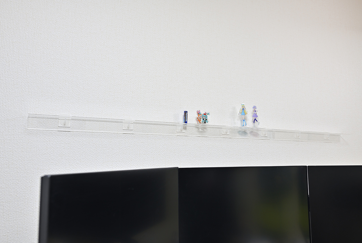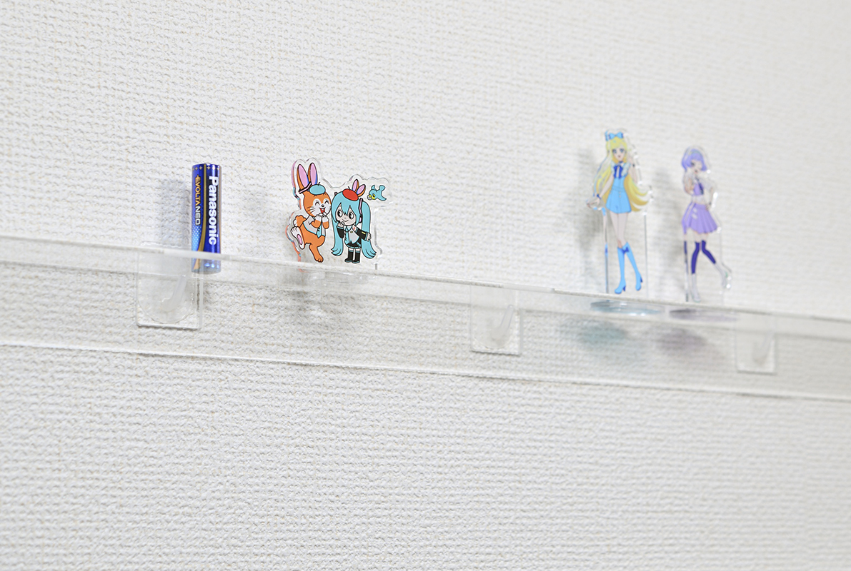 アクリル素材ならではの透明感が、飾るものを引き立て、空間に自然に溶け込む美しさを生み出しています。作業の合間にふと見上げると、お気に入りのキャラクターたちが並んでいる——そんな日常のひとコマが、とても素敵です。
