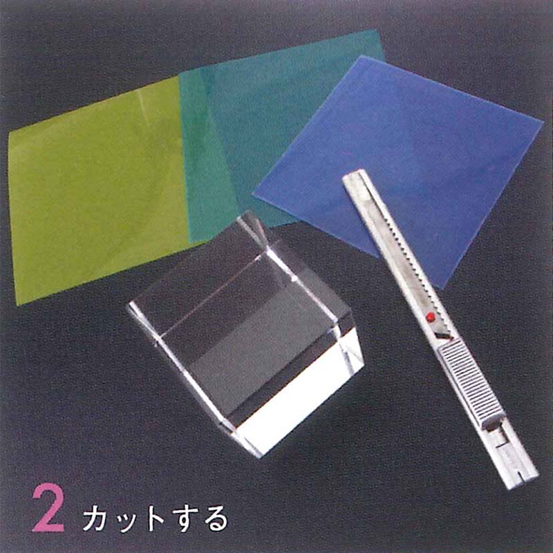 12色相×3階調と白・黒×3階調の計42色から成る、カラークリスタルのように美しい装飾用シート。その透過性を生かし、重ね合わせて貼ることによって、透明色の表現の世界が広がります。どこまでも透明で澄みきった「色水」のような美しさをお楽しみ下さい。