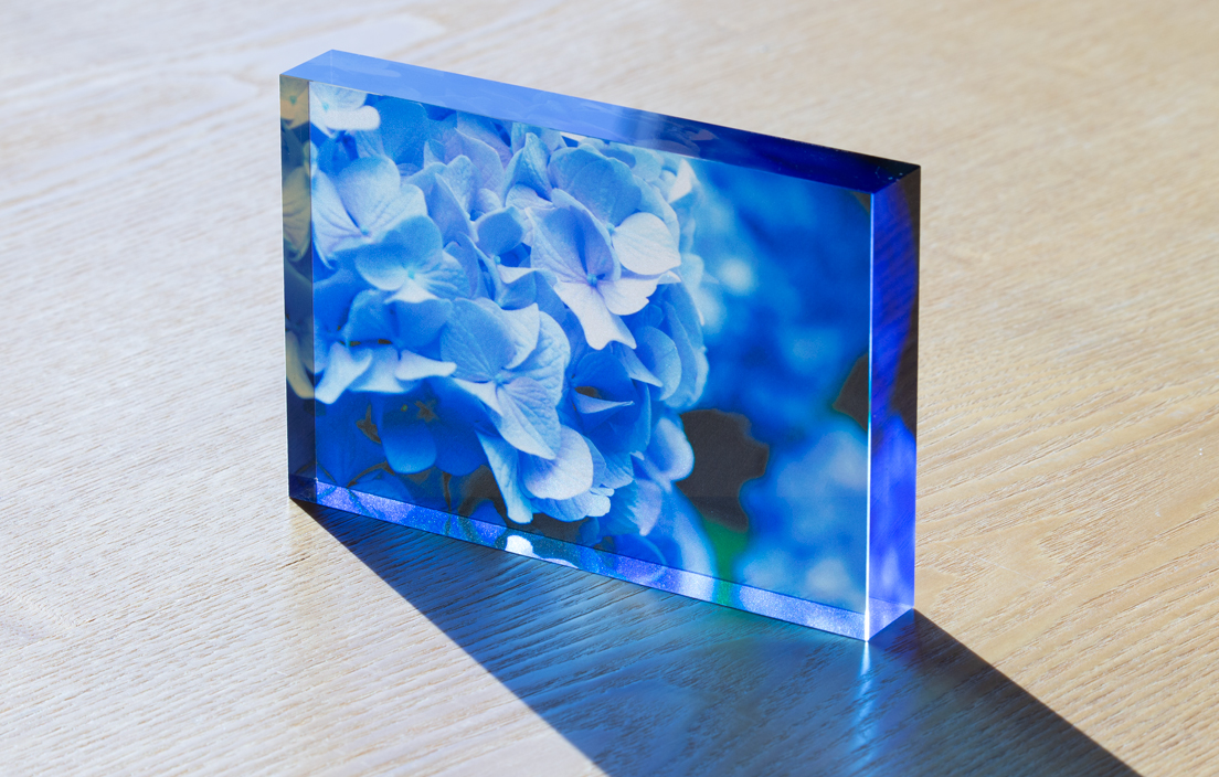 - 側面から反射した光が映り込む等、アクリルの透明感を活かした印刷を希望の場合はこちらがお勧めです。アクリル内でデザインが反射し観る角度によって印象が大きく変わります。